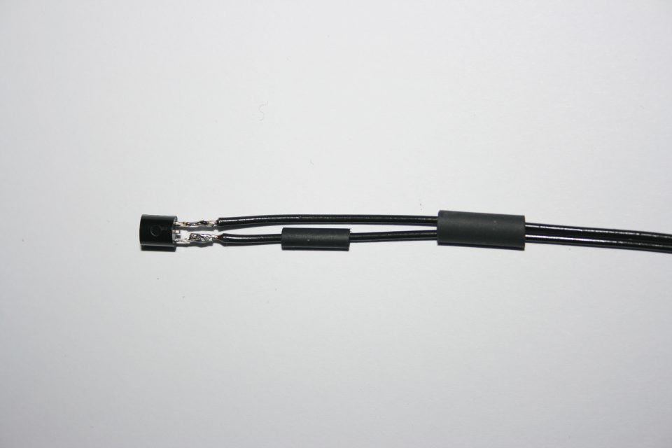 A neat way for soldering wires to the sensor. Put heat shrink sleeving (Ebay) over wires as shown, solder before sliding over joint and shrink with a heat gun. If you have no heat gun you can heat gently with the soldering iron, avoid the tip as solder will stick to the sleeving. Other colours of wire and sleeving may provide a better match to the background where it is fitted.