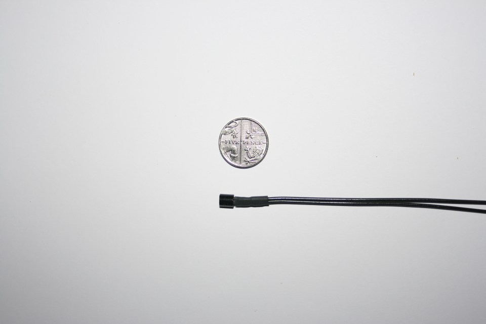 Finished sensor with five pence coin, 18 mm diameter, for size comparison.
